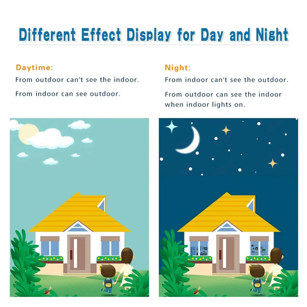 This is a one-way mirror film. Itself is transparent, privacy effect is by the strength of contrast of light to decide. After posted daytime indoor look outside very clear, Outdoor basically can not see the room.The evening can be seen inside and outside, remember to hang curtains.